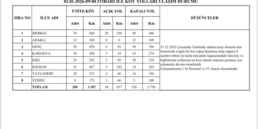 Bingöl'de 2 gün boyunca etkili olan yoğun kar yağışı, hayatı olumsuz etkiledi. Kar yağışıyla birlikte kent merkezi ve ilçelerde ulaşımda aksamalar yaşandı. Yoğun yağışın ardından İl Özel İdaresi karla mücadele ekipleri, köy ve bağlı yerleşim yollarının ulaşıma açılması için çalışmalarını aralıksız sürdürüyor. İl genelinde yürütülen karla mücadele çalışmaları kapsamında 110 personel ve 53 araç görev alıyor. Çalışmalar çerçevesinde 54 köy yolu ulaşıma açılırken kapalı olan 226 köy yolunda ise çalışmaların sürdüğü bildirildi.