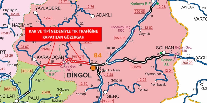 Yetkililerden alınan bilgiye göre, Bingöl-Erzurum Devlet Yolunun 0-88 kilometreleri arası (Kervansaray Kavşağı ile Bingöl-Erzurum il sınırı arası), yoğun kar yağışı ve tipi nedeniyle saat 16.50 itibarıyla tır trafiğine kapatıldı. Ayrıca, Bingöl-Elazığ Yolu'nun 0-46 kilometreleri arası da olumsuz hava koşulları sebebiyle geçici olarak ağır taşıt trafiğine kapatıldı.