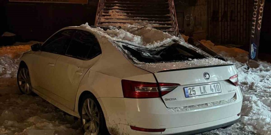 Erzurum'da bir binanın çatısından düşen kar kütlesi park halindeki otomobile büyük zarar verdi.