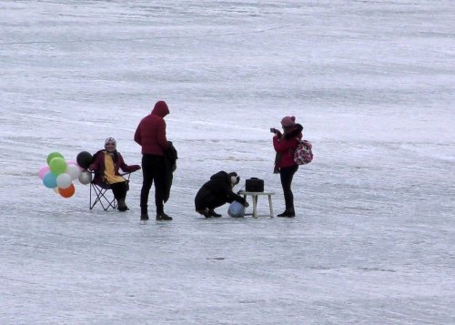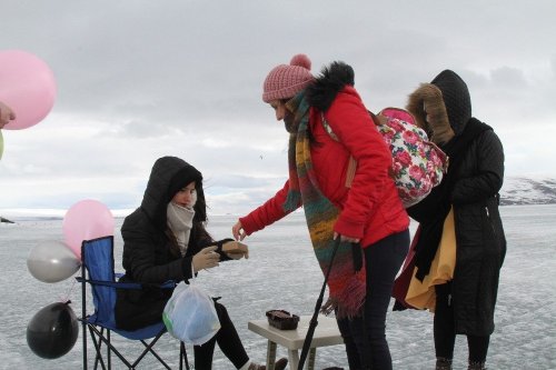 Kışın yüzeyi tamamen buz tutan Çıldır Gölü yerli ve yabacı turistlerin yoğun ilgisini çekiyor. Doğu’ya ilk defa geldiklerini söyleyen 4 kişilik ekipten oluşan gençler her hafta sonu sürekli olarak gezi düzenleyerek seyahat ediyorlar. Arkadaşları olan Ayşegül İçden’in Çıldır gölünü görmeyi çok istediğini, onun için bir sürpriz yapıp doğum gününe denk getirerek buz tutan göl üzerinde pasta keserek kutlayan gençler daha sonra buz üzerinde horon teptiler.