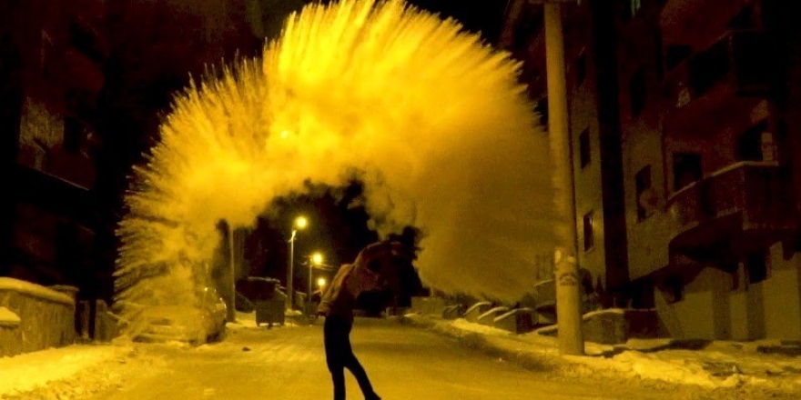 Erzincan’da Soğuk Havada Havaya Serpilen Kaynar Su Yere Düşmeden Buz Oldu