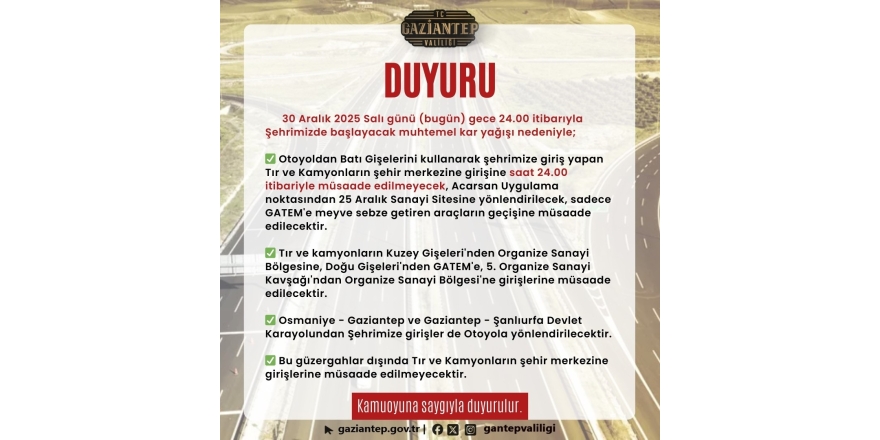 Gaziantep Valiliği, kentte beklenen yoğun kar yağışı nedeniyle trafik güvenliğini sağlamak amacıyla önemli tedbirler aldığını duyurdu. 30 Aralık saat 24.00 itibarıyla tır ve kamyonların şehir merkezine girişlerine kısıtlama getirilecek.