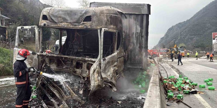D-650 kara yolu Sakarya geçişinde çarpışan iki tırdan biri alev aldı. Karşı yönden gelen otomobilin parçalanan beton bariyere çarpması sonucu karı-koca yaralanırken, yolda uzun araç kuyrukları oluştu.