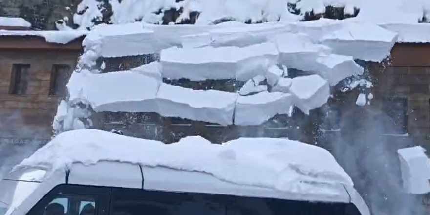 Bitlis'te bir binanın çatısında biriken tonlarca ağırlıktaki kar kütlesinin iş makinesinin üzerine düşmesi paniğe neden oldu.