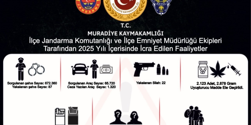 Van'ın Muradiye ilçesinde 2025 yılı içerisinde jandarma ve polis ekiplerince yürütülen çalışmaların verileri paylaşıldı.