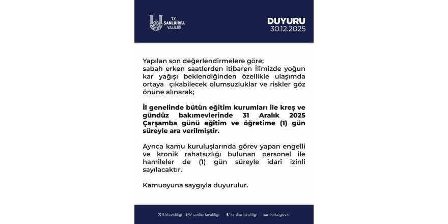 Şanlıurfa Valiliğinden yapılan açıklamada, "Yapılan son değerlendirmelere göre; sabah erken saatlerden itibaren ilimizde yoğun kar yağışı beklendiğinden özellikle ulaşımda ortaya çıkabilecek olumsuzluklar ve riskler göz önüne alınarak; il genelinde bütün eğitim kurumları ile kreş ve gündüz bakım evlerinde 31 Aralık 2025 çarşamba günü eğitim ve öğretime 1 gün süreyle karar verilmiştir. Ayrıca kamu kuruluşlarında görev yapan engelli ve kronik rahatsızlığı bulunan personel ile hamileler de 1 gün süreyle idari izinli sayılacaktır" ifadelerine yer verildi.