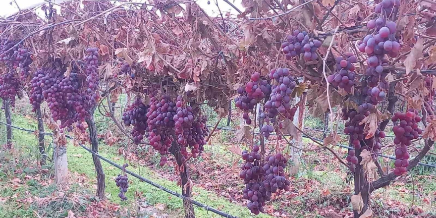 Bağında 10 asma Red Globe üzümü ayıran Osman Tosun, üzümlerini sezonunda kilosu 30 liradan sattıktan sonra bir kısmını dalında bekletmeye başladı. Asmalarda yaprakların neredeyse tamamen dökülmesine rağmen üzümlerin dalında sağlam ve taze kalması dikkat çekti.