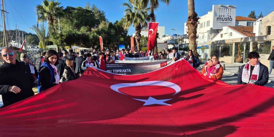 Marina'dan başlayan yürüyüş, Bodrum Belediye Meydanı'nda son buldu. Yürüyüşte öğrenciler tarafından 120 metre uzunluğunda Türk Bayrağı taşındı.