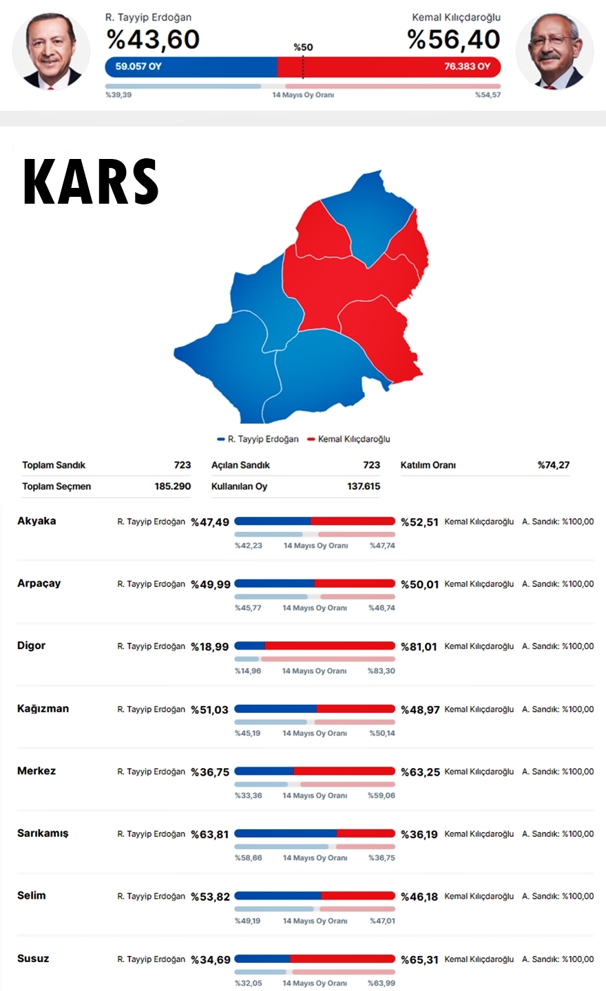 Kars'ta 28 Mayıs Cumhurbaşkanlığı kesin olamayan seçim sonuçlara göre;